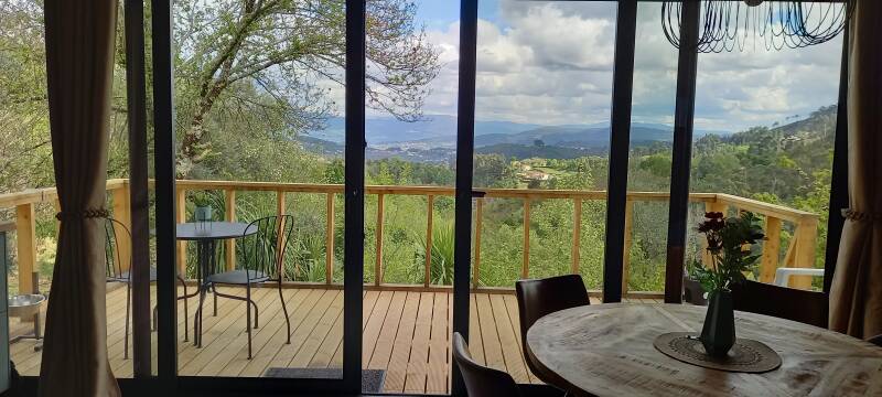 Onze Cabin is van alle gemakken voorzien en heeft een privé plonsbad met buitendouche. Het huisje zelf is voor twee personen en de slaaptrailer ernaast kan erbij gehuurd worden. Het heeft een stapelbed voor 2 kinderen of een 2-persoonsbed voor volwassenen. Geniet van je ruime veranda met wijds uitzicht richting het dal.